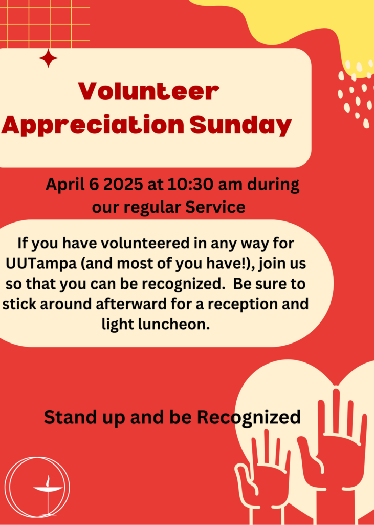 Mark your calendars! All church volunteers will be recognized on Sunday April 6, 2025. Be sure to come to church that day and stay for special goodies after church.